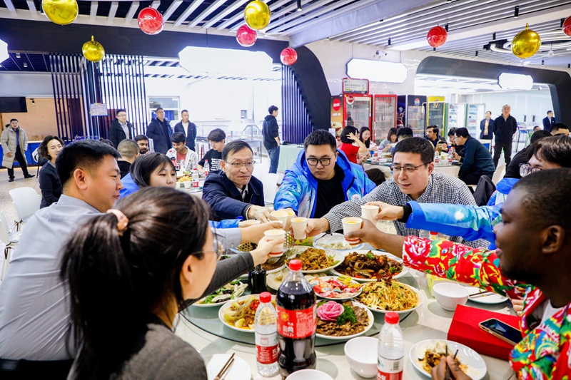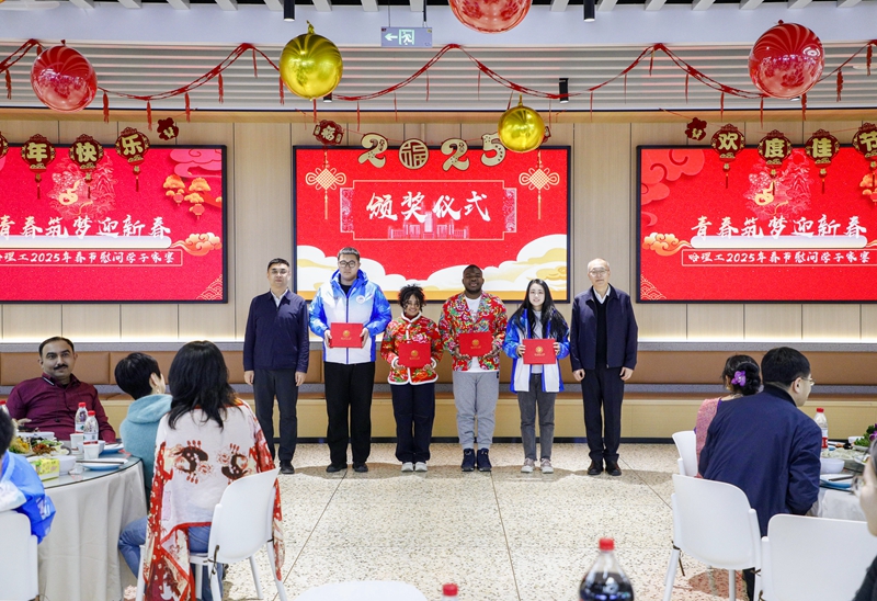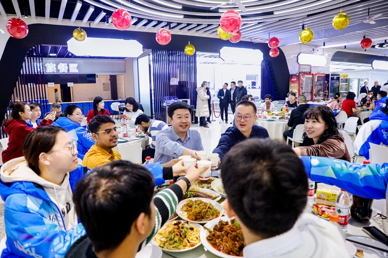 期间,学校领导前往西校区中心食堂,亲切慰问亚冬会志愿者代表和在校留学生代表,与师生欢聚一堂,共同庆祝新春佳节。来自马达加斯加的茉莉同学和刚果(金)的李曼同学携手献唱《东北的冬》,独特的嗓音和对歌曲的精彩诠释引发阵阵掌声;来自斯里兰卡的玛丽莎同学表演了民族舞蹈,灵动的舞姿展现独特异域风情。活动尾声,全场师生齐声高歌《我爱你,中国》,激昂的歌声表达了对中国的热爱以及对第九届亚冬会的美好祝愿。“你比我猜”“杯水传情”等趣味游戏将现场气氛推向高潮,留学生与志愿者在欢声笑语中拉近了距离,共同度过了一个温馨难忘的春节。