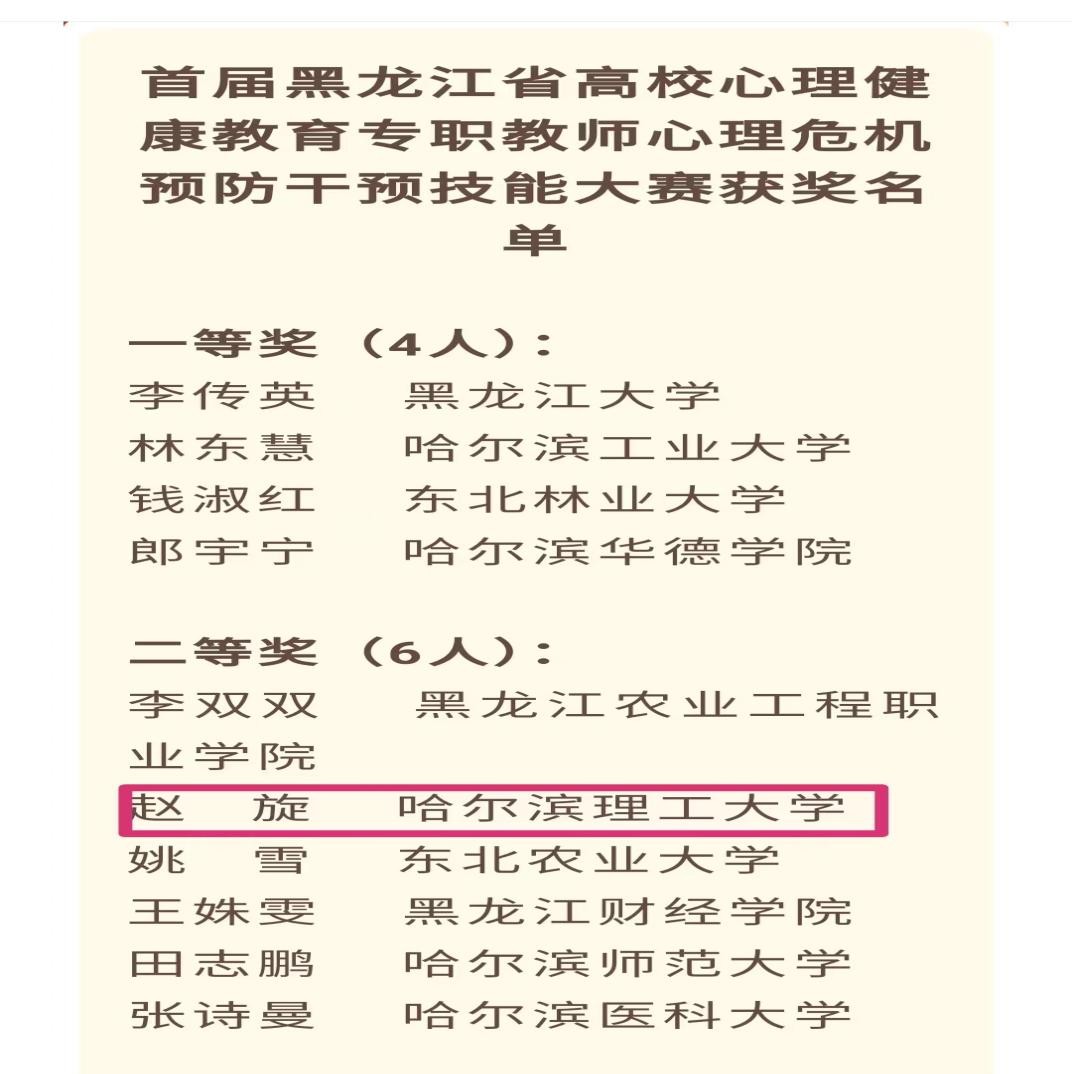 为进一步提升太阳成官网专职心理健康教育教师的综合能力,加强心理危机干预与处置专业水平,学校大学生心理健康教育中心选派教师代表参加了由黑龙江省教育厅主办,黑龙江大学承办的首届黑龙江省高校心理健康教育专职教师心理危机预防干预技能大赛。