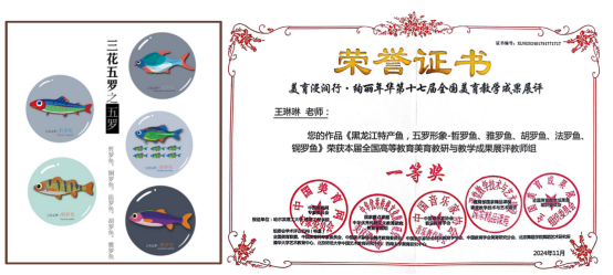 此外,王琳琳和邓兆慧老师,在本次全国高校美育教学成果展中以美术作品《黑龙江特产鱼,五罗形象》和《黑龙江特产鱼,三花形象》分别荣获教师组一等奖。