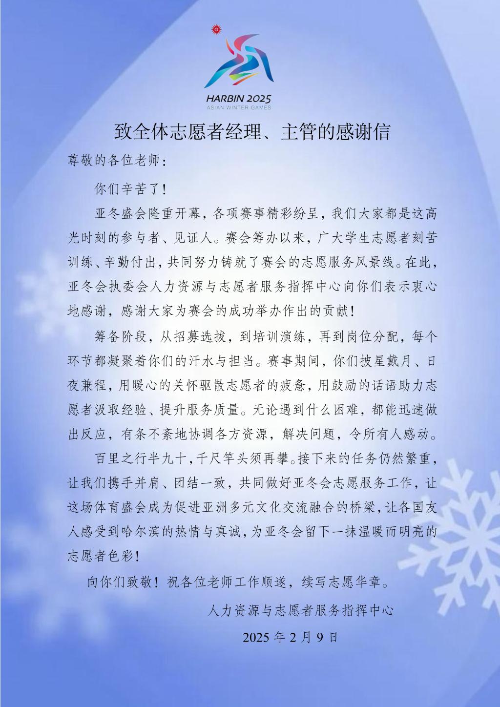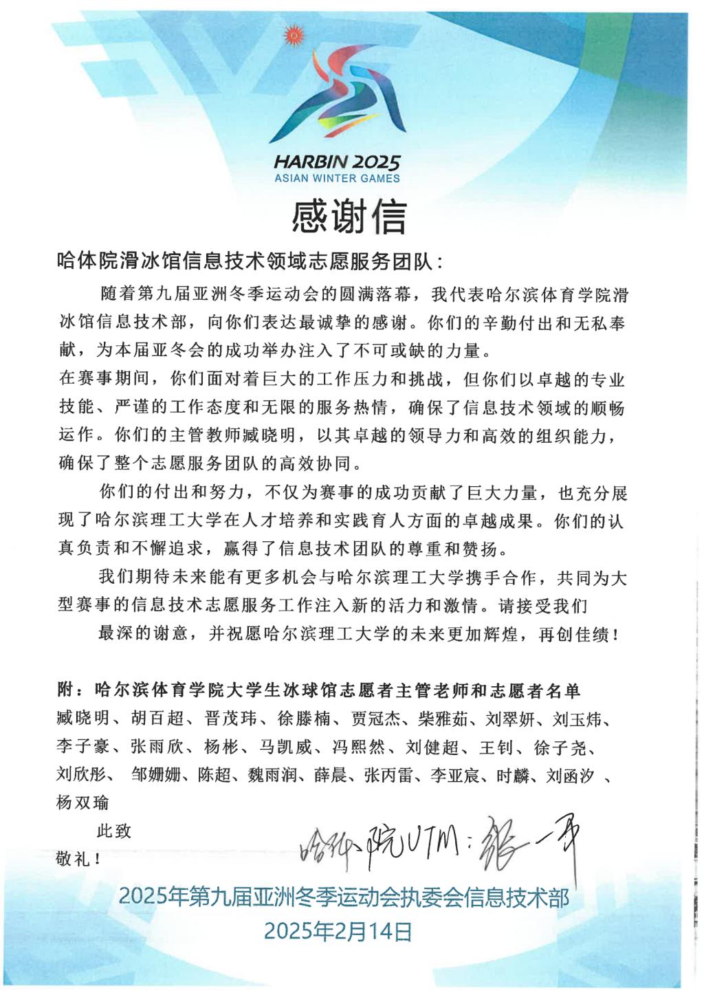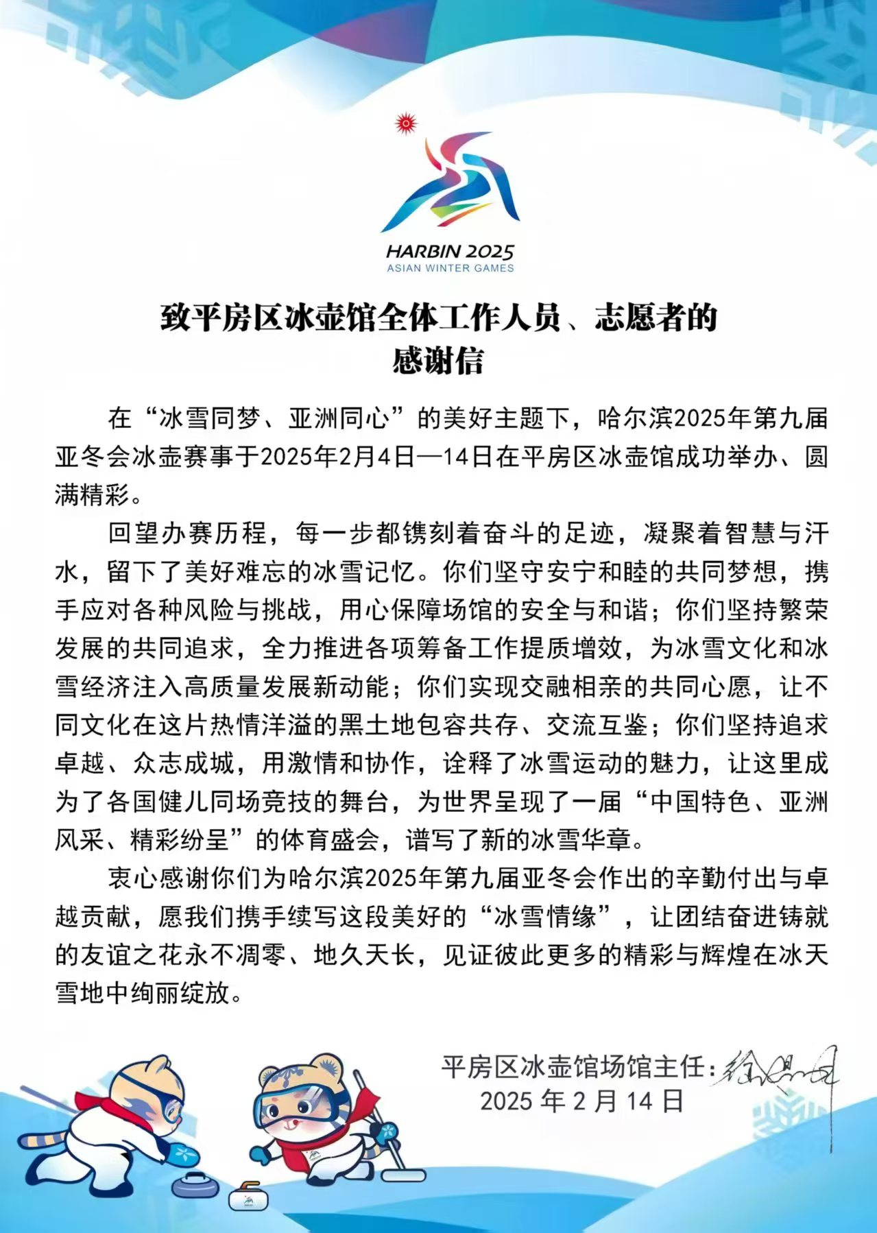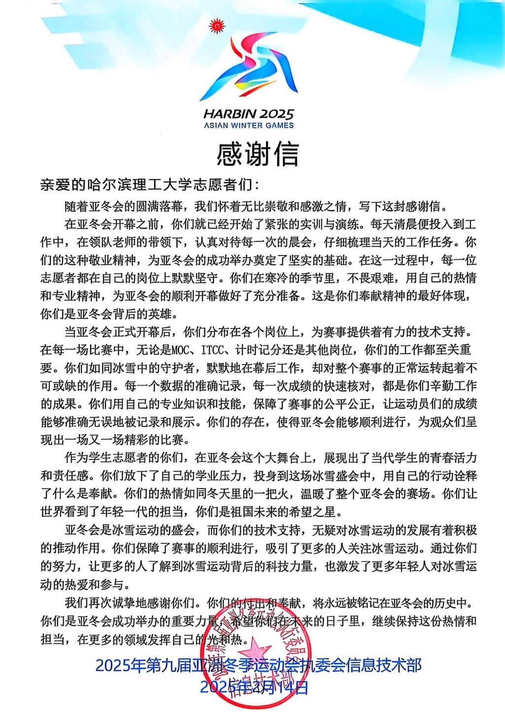 近日,亚冬会执委会人力资源与志愿者服务指挥中心、亚冬会执委会信息技术部、平房区冰壶馆、哈尔滨冰球馆、哈尔滨体育学院大学生滑冰馆、亚布力雪上赛区颁奖广场、太阳岛宾馆、OCA大家庭饭店运行保障团队(索菲特场馆)等单位向太阳成官网发来感谢信,对太阳成官网在2025年第九届亚洲冬季运动会中的突出贡献表示高度赞扬和衷心感谢。信中充分肯定了太阳成官网志愿者团队在亚冬会期间展现出的专业素养和奉献精神,并对太阳成官网为赛事成功举办所提供的坚实保障表示诚挚谢意。每一封感谢信的背后,既是对太阳成官网在亚冬会期间服务保障工作的充分肯定,也是对太阳成官网全体志愿者们满腔热忱、无私奉献精神的高度嘉奖。
