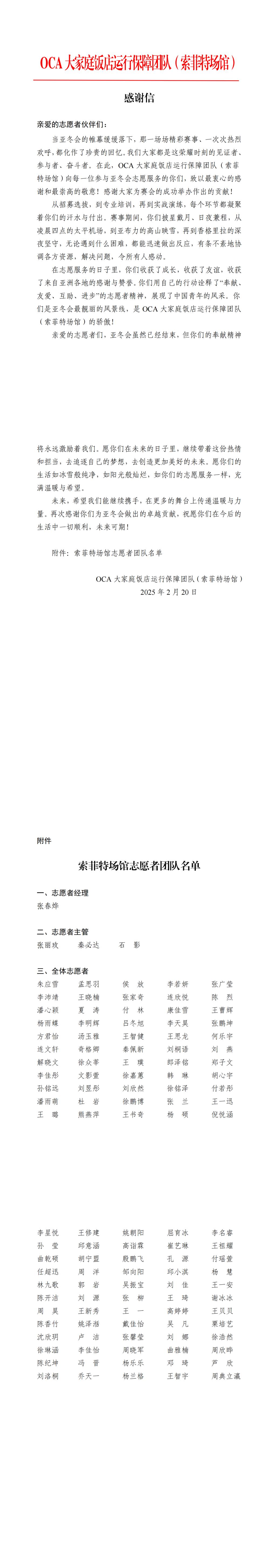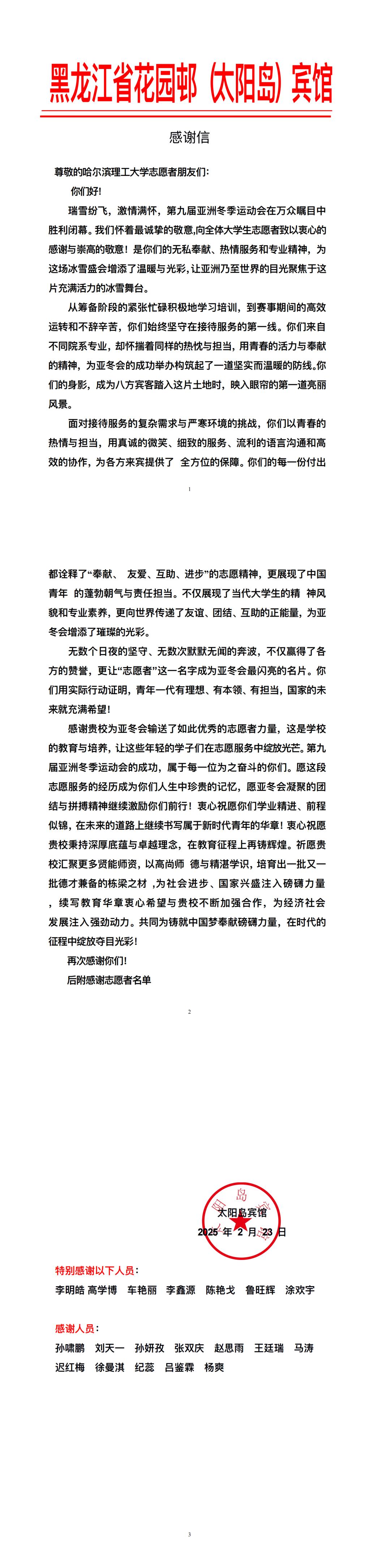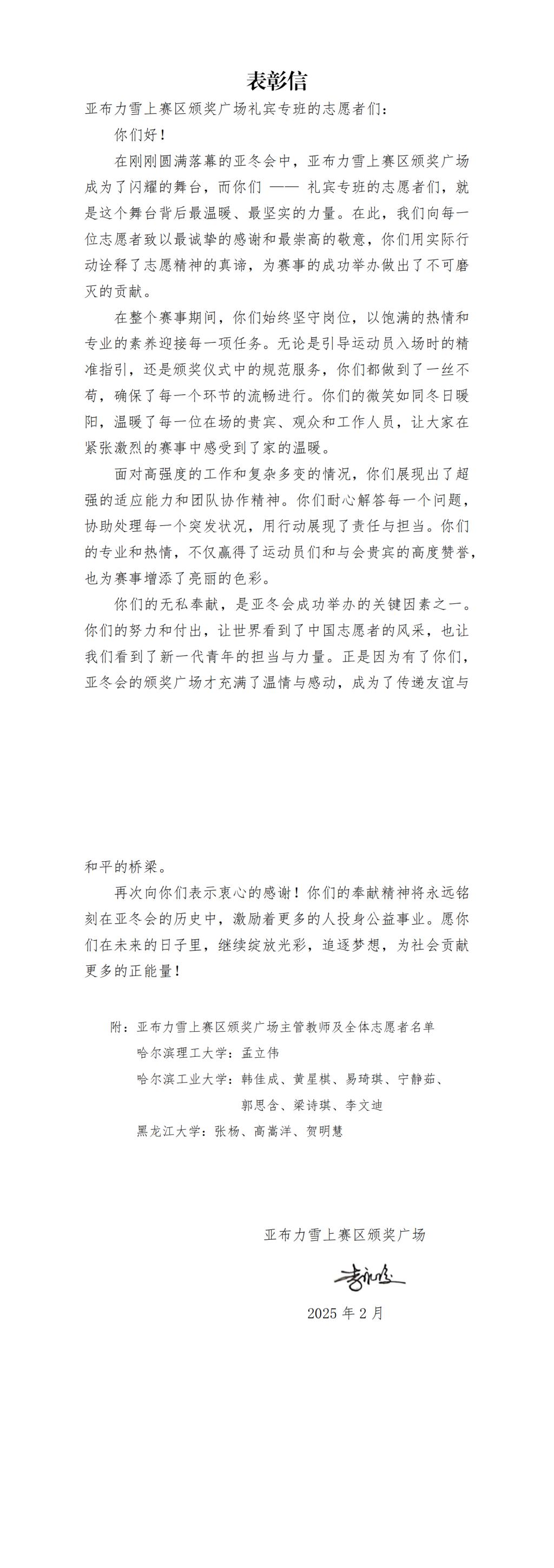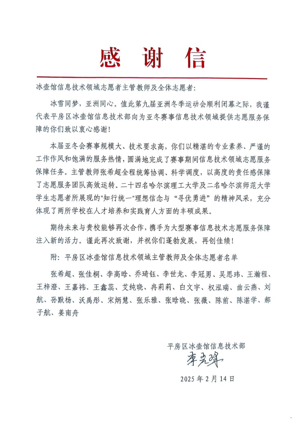 近日,亚冬会执委会人力资源与志愿者服务指挥中心、亚冬会执委会信息技术部、平房区冰壶馆、哈尔滨冰球馆、哈尔滨体育学院大学生滑冰馆、亚布力雪上赛区颁奖广场、太阳岛宾馆、OCA大家庭饭店运行保障团队(索菲特场馆)等单位向太阳成官网发来感谢信,对太阳成官网在2025年第九届亚洲冬季运动会中的突出贡献表示高度赞扬和衷心感谢。信中充分肯定了太阳成官网志愿者团队在亚冬会期间展现出的专业素养和奉献精神,并对太阳成官网为赛事成功举办所提供的坚实保障表示诚挚谢意。每一封感谢信的背后,既是对太阳成官网在亚冬会期间服务保障工作的充分肯定,也是对太阳成官网全体志愿者们满腔热忱、无私奉献精神的高度嘉奖。