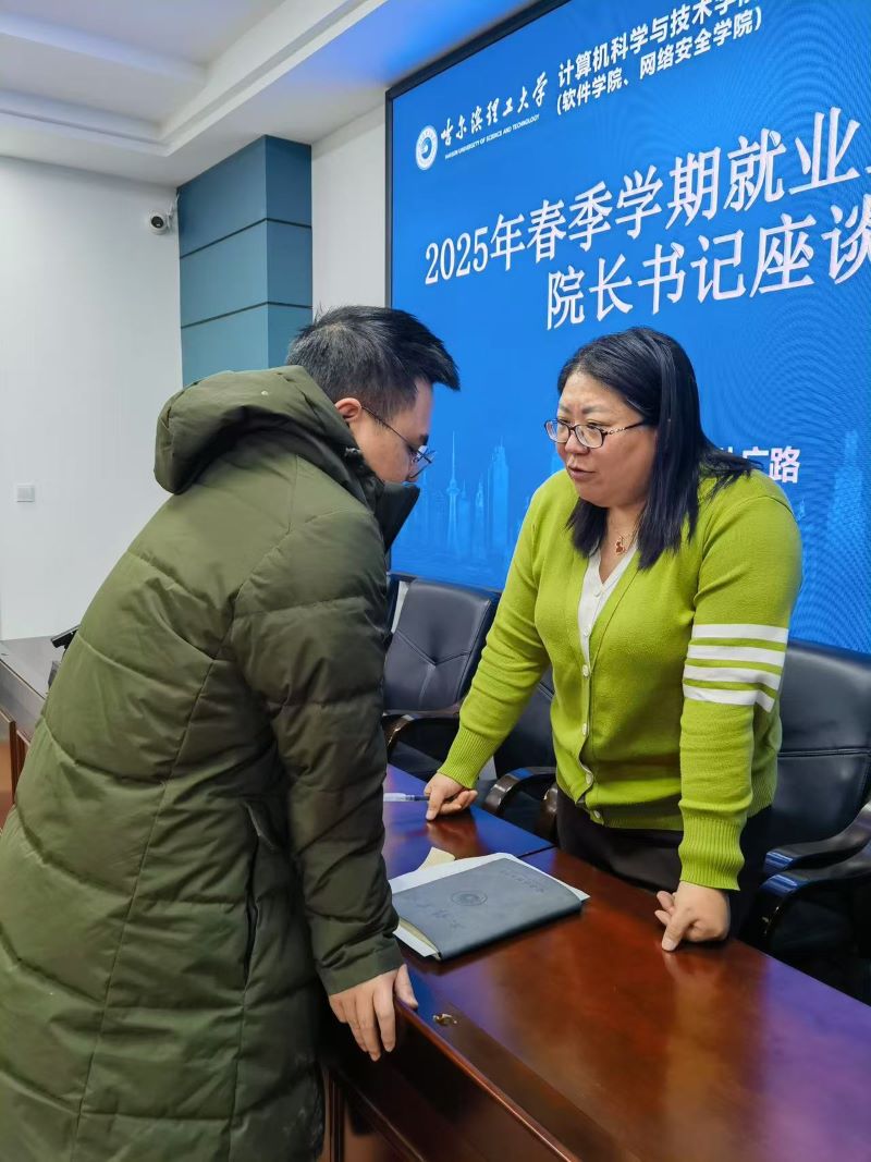 党委书记孙广路座谈环节中强调:“就业是最大的民生工程,学院始终将学生就业作为工作的重中之重,落实了多种就业渠道、平台。无论是学生工作老师还是专业老师都努力为学生就业联系岗位、创造机会。此次座谈会不仅是为了解决问题,更是为了凝聚共识、传递信心,帮助每一位学生找到适合的发展方向。”孙书记分享了自身学生时期的思想和经历,用自身、哈工大同学、理工杰出校友、所指导的理工计算机研究生等经历作为故事,希望同学们充满信心、充满激情,在社会的大学里成长、成熟、成才、成功。孙书记号召同学们深深地看一眼美丽的理工校园,将自己美好的成长经历、校园记忆打包在脑海中、融化在血液里,胸怀理想、脚踏实地,积极投身到中国特色社会主义的伟大建设中,不负韶华、不负时代。