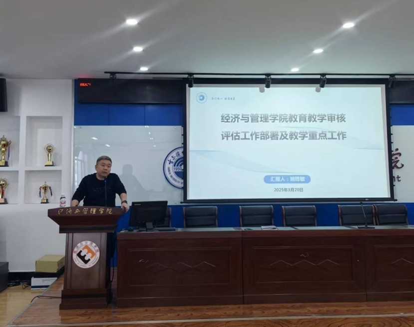 副院长姚锋敏分别就《经济与管理学院教育教学审核评估工作部署及教学重点工作》和《2025年经济与管理学院绩效工资分配实施细则(修订)》进行了深入细致的部署和解读。围绕本科教育教学审核评估工作,他详细阐述了学校迎评总体工作安排、学院评估工作进展、评估期间工作要求、评估期间注意事项及本学期的教学重点任务等,强调全院上下要高度重视审核评估工作,做到“全员参与、履职担当、落实到位、责任到位”,严格按照学校和学院工作要求扎实推进各项迎评准备工作,为学校高质量通过审核评估奠定坚实基础。在绩效工资分配实施细则解读中,他传达了学校绩效工资改革的思路和工作要求,深入剖析了修订后的绩效工资分配方案,重点讲解了修订背景与过程、意见征求与完善、新旧两版分配细则的主要变化,旨在通过科学合理的绩效工资分配,充分调动教职工的工作积极性和创造性,激励大家在各自岗位上努力工作,为学院发展贡献力量。