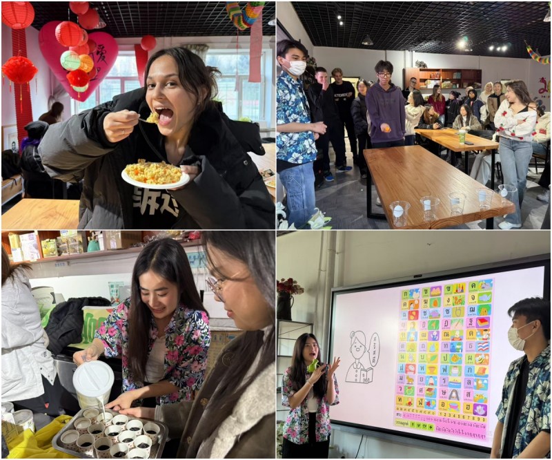 活动现场,从泰语字母、发音,到闻名遐迩的泼水节,两位同学不仅展示了节日服饰,还介绍了传统游戏。在泰国歌曲的旋律中,同学们载歌载舞,表现最佳者获得了绣有泰国传统图案的布包。此外,两位同学还亲手制作泰式甜奶、炒饭,让大家品尝到地道的泰国味道。