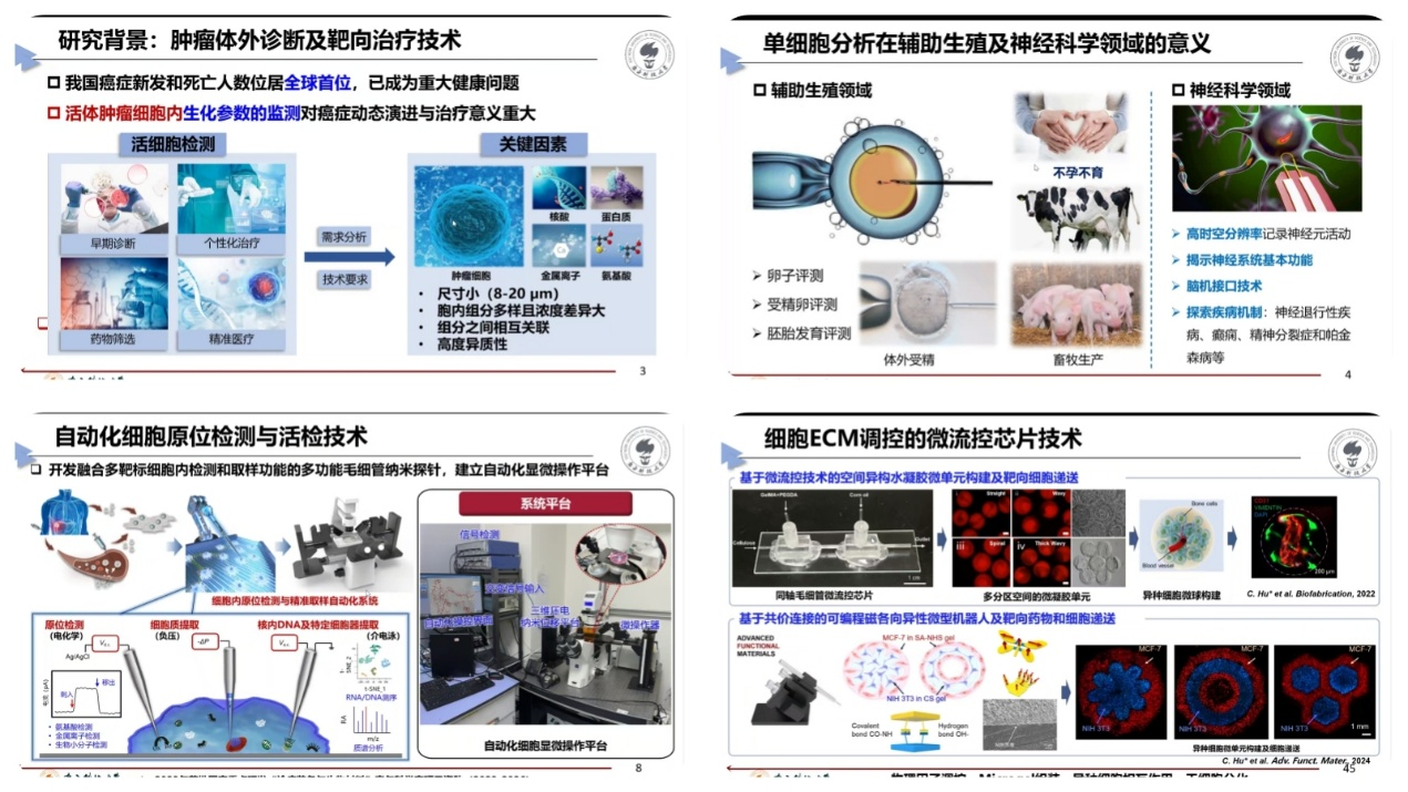 报告会上,胡程志副教授主要介绍了团队在面向肿瘤体外诊断与靶向治疗的微纳机器人技术的一些最新研究成果。首先,胡程志副教授介绍了肿瘤体外诊断及靶向治疗技术的研究背景,并强调了单细胞分析在辅助生殖及神经科学领域的意义。他指出,单细胞分析技术能够揭示细胞间的异质性,为精准医疗提供关键信息,对于发展高效、精准的肿瘤体外诊断和靶向治疗技术至关重要。其次,他详细阐述了团队研发的面向细胞活检与检测的自动化显微操作系统,该系统基于多传感融合的闭环控制策略,构建了高效的闭环显微操控机器人系统,实现了高通量、低损伤的自动化细胞多维动态信息获取,并进一步实现了微尺度多目标灵巧生物操作。最后,他介绍了团队在游动微纳机器人及靶向肿瘤治疗技术方面的最新进展,通过高精度细胞微环境调控的微流控芯片技术,团队成功实现了空间异构水凝胶微单元的构建及靶向细胞递送,同时,基于共价连接的可编程磁各向异性微型机器人,实现了靶向药物和细胞的精准递送。这些技术为肿瘤体外诊断与靶向治疗提供了新的思路和方法。