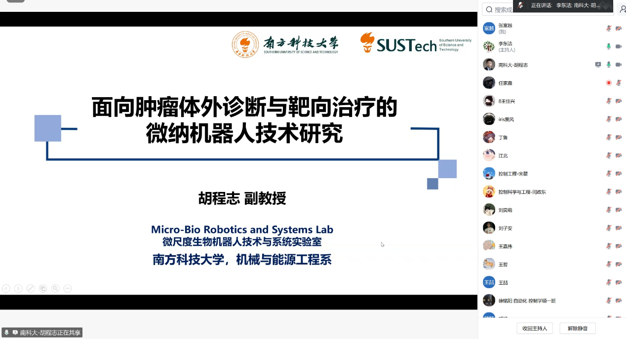为激发学院师生科研热情、促进院校间学术交流,应自动化学院邀请,4月29日,国家级青年人才、深圳市“孔雀计划”B类人才、微尺度机器人技术与系统实验室主任、中国微米纳米技术学会微纳机器人分会理事、南方科技大学胡程志副教授作了题为“面向肿瘤体外诊断与靶向治疗的微纳机器人技术研究”的学术报告。报告会由自动化学院副院长李东洁教授主持,相关学院教师、硕博研究生等50余人在线参会。