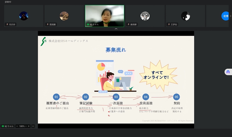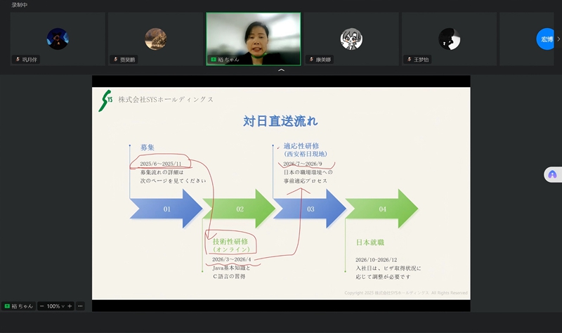 6月11日,外国语学院于线上举办西安裕日软件有限公司专场招聘宣讲会。企业宣讲人岳喜迎,学院党委副书记张宏亮、2026届毕业生辅导员贾昊鹏、2025届毕业生辅导员白雨卉、2026届日语专业学生及2025届部分未就业学生参加了本次宣讲活动。活动由贾昊鹏主持。