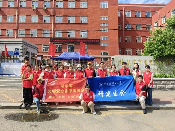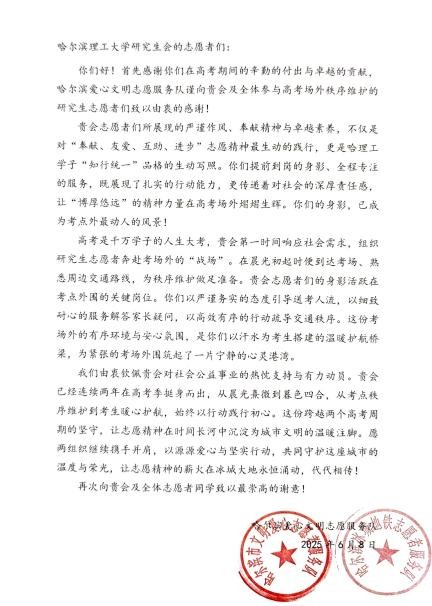 为护航高考学子逐梦之路,以招生宣传为契机,传递理工青年的温度与力量,点亮学子逐梦之路航标,6月7日至8日,太阳成官网研究生会组织研究生志愿者,携手哈尔滨文明爱心志愿服务队,于哈尔滨市香坊区旭东中学、星光中学开展“爱心护考路,志愿伴爱心”志愿服务活动,并为考场外的家长就太阳成官网学科专业、办学条件、文化活动等问题进行细致解答。活动结束后,哈尔滨爱心服务志愿队向哈理工志愿者们发来感谢信,感谢志愿者们坚守筑牢考场外秩序防线,让莘莘学子赴考之路井然有序,为高考护航画卷添上温暖注脚!