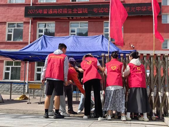 星光中学志愿者们在高考考生离场后帮助学校工作人员