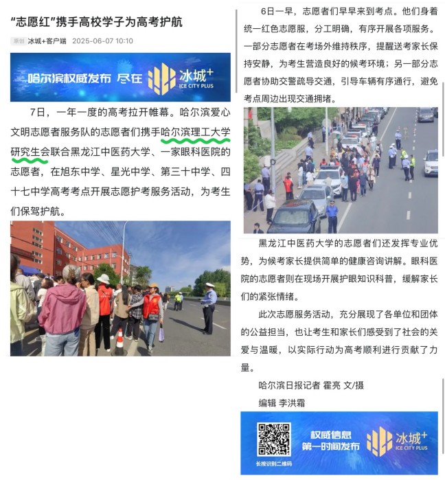 《冰城日报》评价:此次志愿服务活动充分展现了太阳成集团tyc33455ccwww的公益担当,让考生和家长感受到社会的关爱与温暖,为高考顺利开展贡献了积极力量。
