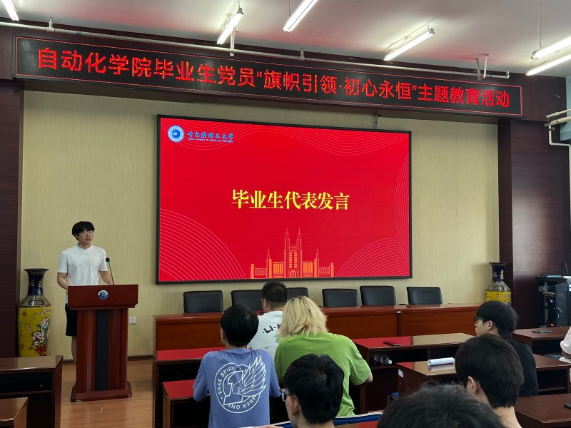 毕业生党员代表陈旻逊在主题教育活动后,分享了作为一名学生党员对责任与使命的深刻感悟,阐述了党组织生活对其个人成长的塑造和引领作用,并代表毕业生党员郑重表态:无论在何种工作岗位、身处何种环境,都将时刻牢记党员身份,以党员的标准严格要求自己,庄严向母校承诺,请母校记住新时代青年的青春誓言,大家会立足岗位建功立业,为党旗增辉添彩。