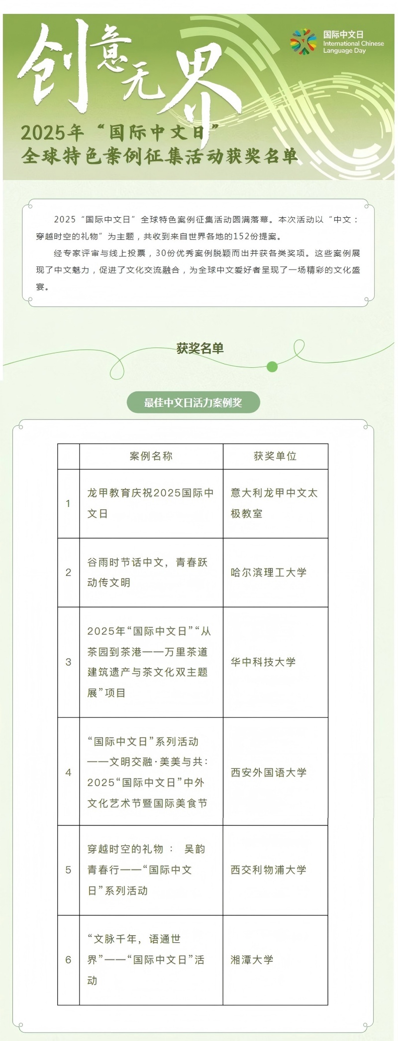 近日,由中文联盟主办的以“中文:穿越时空的礼物”为主题的2025“国际中文日”全球特色案例征集活动落下帷幕。活动设立五大特色奖项,为各类优秀案例搭建了专属的展示平台。本次活动主办方共收到来自世界各地的152份创意提案,经过专家评审的专业考量与线上大众的热情投票,30份兼具创意与实效的优秀案例从中脱颖而出,并分获各类奖项。其中,外国语学院4月20日在新主楼前广场举办的国际中文日活动案例——“谷雨时节话中文,青春跃动传文明”凭借独特的活动设计、浓厚的文化氛围和师生的广泛参与度,成功斩获“最佳中文日活力案例奖”。