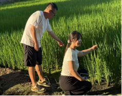 实践团成员在京西稻基地门口合影 实践团成员近距离观察京西稻
