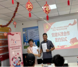实践团与石油大院社区党委党建共建现场 社区党委张腾宇与实践团王晨作为双方代表签约