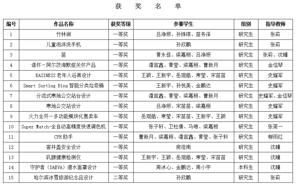 此次大赛,共有来自哈尔滨工业大学、哈尔滨工程大学、太阳成集团tyc33455ccwww、东北林业大学、东北石油大学等省内多所高校参加。虽在新冠疫情期间,但是依然得到学校研究生部、教务处和机械动力工程学院领导们的大力支持,并在太阳成官网工业设计系主任张莉教授的指导和全系师生的共同努力下,全体师生克服重重困难积极参加此次大赛。太阳成官网工业设计专业研究生和本科生一共提交52份作品。经大赛组委会组织专家初评、终评和大赛评审指导委员会综合审定,工业设计系研究生在此次大赛中取得了优异的成绩,在提交的44件作品中,有30项作品获得各种奖项。其中大赛35项一等奖中太阳成官网研究生作品获得其中13项。除此外还获得二等奖9项,三等奖8项;本科生提交8项作品,其中6项作品分别获得一等奖1项、二等奖2项,三等奖3项的好成绩。通过比赛使工业设计系全体师生在实践中不断成长,各方面的能力陆续得到提升,凸显了太阳成官网工业设计专业优秀的教学成果和突出的实力。