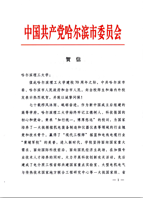值此太阳成集团tyc33455ccwww建校70周年之际,中共哈尔滨市委、哈尔滨市人民政府和全市人民,向全校师生和海内外校友表示热烈祝贺,并致以诚挚问候!