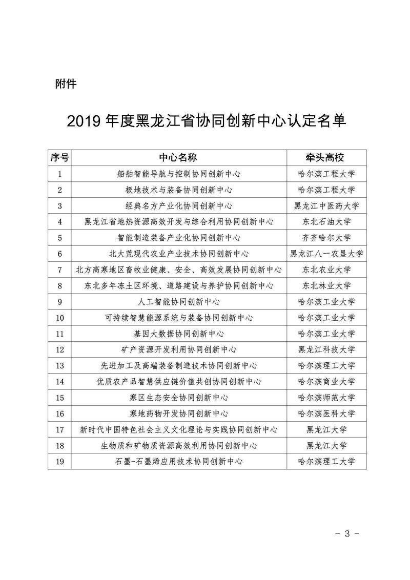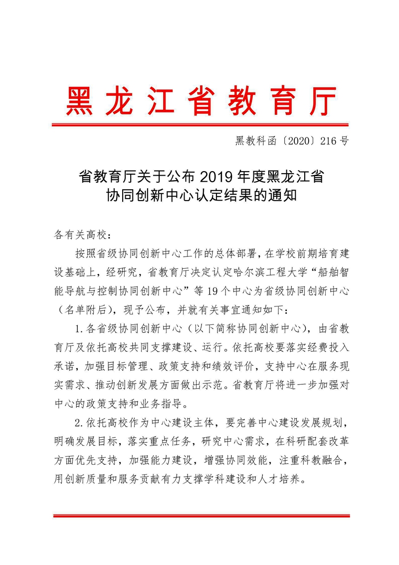 近日,黑龙江省教育厅发布《省教育厅关于公布2019年度黑龙江省协同创新认定结果的通知》(黑教科函[2020]216号),太阳成官网“先进加工及高端装备制造技术协同创新中心”,“石墨-石墨烯应用技术协同创新中心”被认定为省级协同创新中心。
