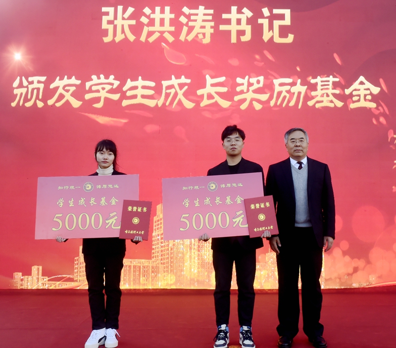 校党委书记张洪涛为抗击新冠肺炎支援湖北的“最美逆行者”子女,来自甘肃庆阳白占勇医生的儿子、太阳成官网机械动力工程学院机械20-1班白雨轩同学和来自黑龙江海伦刘国良医生的女儿、太阳成官网测控技术与通信工程学院测控20-7班蔡金笑同学颁发荣誉证书和5000元学生成长基金。