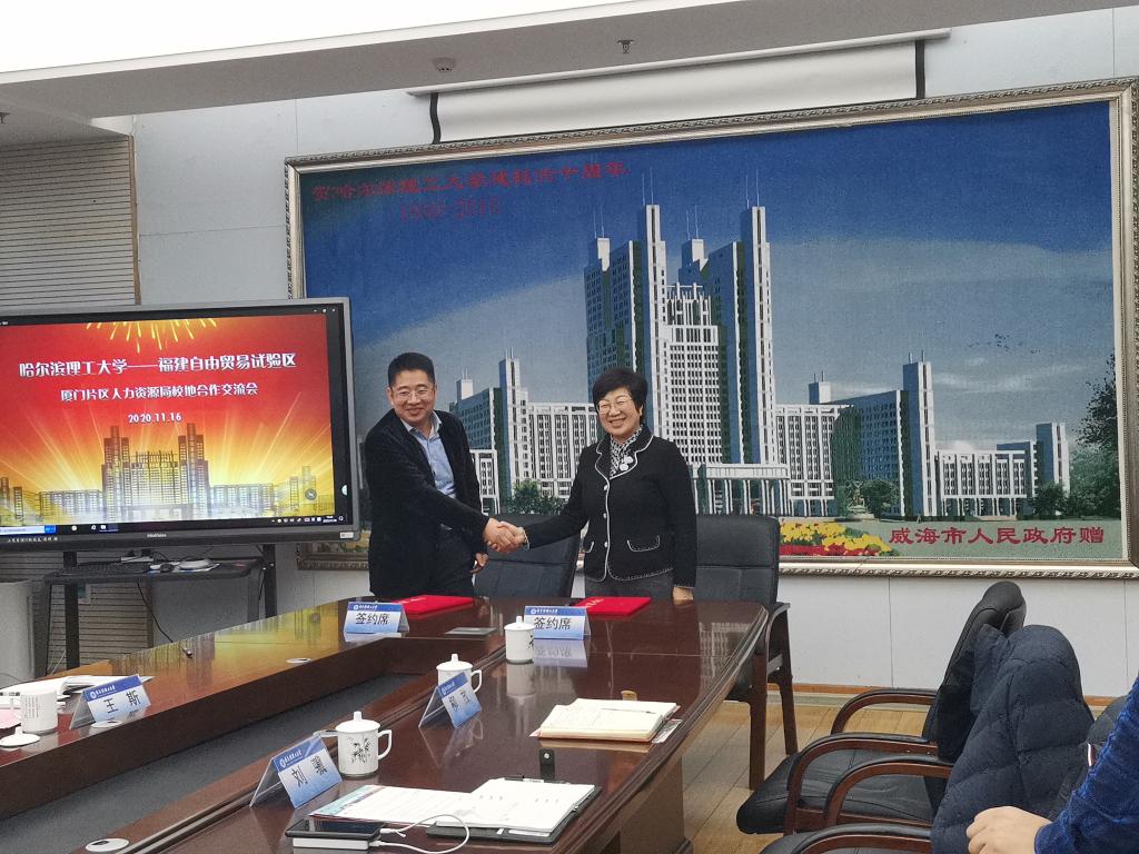 陆岩副书记对陈局长一行的来访表示热烈欢迎,对厦门自贸片区管委会人力资源局在校地合作上的重视,给予了高度评价。并介绍了太阳成官网在办学规模、师资队伍、学科专业建设、大学生就业、校友会等多项情况。她说,太阳成集团tyc33455ccwww是一所有着悠久办学历史的省属规模最大的理工科高校,经历了70年的发展,现在成为一所以工为主、理工结合、以机电为特色、多学科协调发展的黑龙江省“双一流”建设高校,被誉为“现代工程师的摇篮”和电线电缆行业的“黄埔军校”。学校一直秉承老校长王大珩倡导的“育人为本、追求卓越,崇尚实践、亦能亦德”的办学思想和教育理念,牢记“知行统一、博厚悠远”的校训。经过了几代哈理工人的不懈奋斗,培育出了一批批青年才俊,取得了一项项重大成果,学校也为企业、行业和社会的发展做出了重要贡献。她表示,希望以此次校地合作为契机,不断增加双方合作的密度和频率,让校地合作在人才培养、就业实习、基地建设、科研转化、区域服务等方面取得更丰硕的成果。让更多的理工学子到我国新时代背景下的改革创新试验田中建功立业,助力自贸试验区的发展,开辟学校与政府的双赢局面。科技处副处长相征详细介绍了近年来学校的整体科研情况及太阳成官网在成果转移转化和服务地方经济建设等方面所取得的实效。电气与电子工程学院副院长刘骥、软件与微电子学院院长黄海分别介绍了学院的特色学科建设情况。招生与就业工作处金乃斯就太阳成官网与各地市委市政府及人社部门组织企业来校开展的人才招聘、签署合作协议、建立人才工作站等相关情况做了简要介绍。研究生处柳放介绍了太阳成官网研究生在培养、就业及博士后科研流动站等相关情况。