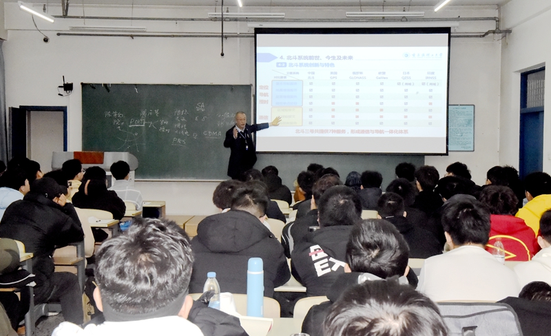 随后,赵琳校长以“珠峰测量”开篇,说明北斗全球导航系统应用情况,引起了同学们关注北斗、探索导航的兴趣。他从走进导航,卫星导航及其发展,北斗系统的前世、今生与未来等方面内容进行介绍,由浅入深、循序渐进地介绍了导航和卫星导航的发展历程、分类情况、科学原理、应用领域,分析了美国、俄罗斯、中国和欧盟建立的四大全球导航系统以及2个区域导航系统、5个天基增强系统的发展建设情况。他指出,2020年7月31日,北斗三号全球卫星导航系统建成暨开通仪式在北京举行。习近平总书记铿锵有力地宣布:“北斗三号全球卫星导航系统正式开通!”这标志着我国建成了独立自主、开放兼容的全球卫星导航系统,中国北斗从此走向了服务全球、造福人类的时代舞台。北斗三号全球卫星导航系统的建成开通,是我国攀登科技高峰、迈向航天强国的重要里程碑,是我国为全球公共服务基础设施建设作出的重大贡献,是中国特色社会主义进入新时代取得的重大标志性战略成果,凝结着一代代航天人接续奋斗的心血,饱含着中华民族自强不息的本色,对推进我国社会主义现代化建设和推动构建人类命运共同体具有重大而深远的意义。