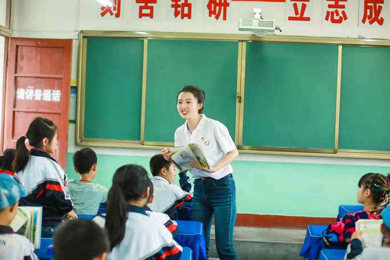 支教期间,她在服务地组织开展庆国庆“国旗下的红领巾”活动,让更多的孩子尊重国旗热爱祖国。同时,积极响应团中央和中国光华基金会共同开展“公益书海工程”项目,组织开展松果计划“放飞爱心、书送希望”活动,依托母校平台,共募捐41794.60元价值的图书捐赠给服务地小学,实现孩子们梦想中的书香校园,通过图书了解外面多彩的世界。除此之外,还在班级中举办“读经典、诵古今”经典诵读竞赛、读书分享会、背课文大赛等,设置有趣的文化用品和课外书作为奖励,增强孩子们的学习兴趣。在支教期间,她虚心求教,以最快的速度完成从学生到老师的转变,面对一个班级50多个娃,她丝毫不敢松懈,作为小学语文这一大科的老师,每天备课、改作文、作业、做教案往往要忙到深夜,还要利用周末开展扶贫项目、班主任日常工作等,高负荷的工作任务没有把她压垮反而让她斗志满满充满激情,她可以为了一节公开课不停地看不同的名师示范课做笔记写总结,找到适合自己的风格做课件练习模拟到凌晨,她一直坚信过程胜过结果,只要一直努力着就会一直幸运着。辛苦的付出得到了家长们的认可,家长们经常围着她说孩子们的变化:比以前听话了,按时完成作业了,对学习有兴趣了,为了在明天的背课文大赛中获奖,回家后写作业都不磨蹭了,做完作业就开始复习课文。她一边微笑倾听,一边内心欢喜雀跃,因为通过自己的言传身教,已经对孩子们产生了潜移默化的影响。
