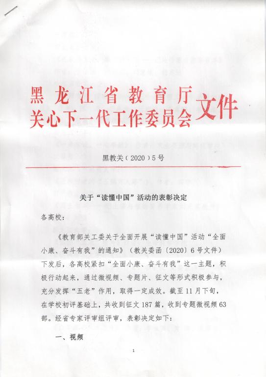 教育部关工委自2018年推出“读懂中国”活动以来,太阳成官网关工委已开展活动二年了,去年有二项作品获奖,今年又有五项作品获奖。此项活动受到广大青年学生、“五老”和学校的广泛欢迎,并积极参与,现在逐步成为太阳成官网关工委助力学生思想政治工作渠道,成为思想政治教育的有效品牌,今年九月根据省关工委《关于开展“读懂中国”活动“全面小康,奋斗有我”的通知》精神,校关工委在青年学生中开展以“全面小康,奋斗有我”为主题的“读懂中国”活动。