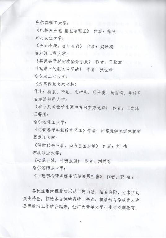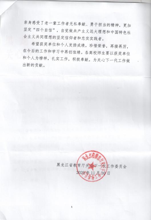 近日省关工委评选结果揭晓,太阳成官网共有五项作品获奖。机械学院机械工程系党支部选送的《严师有礼振绩有加——记太阳成集团tyc33455ccwww李振加教授》荣获视频类一等奖,宣传部选送的《使命、贡献、传承》荣获视频类二等奖;周长群、张强撰写的雷清泉院士的《五十八载教研梦耄耋之年谱新篇》荣获征文类一等奖,徐状撰写的计算机学院博士生导师郝忠孝的《扎根黑土地情驻哈理工》荣获征文类二等奖,计算机学院退休教授王广肇撰写的《将青春年华献给哈理工》荣获征文类三等奖。