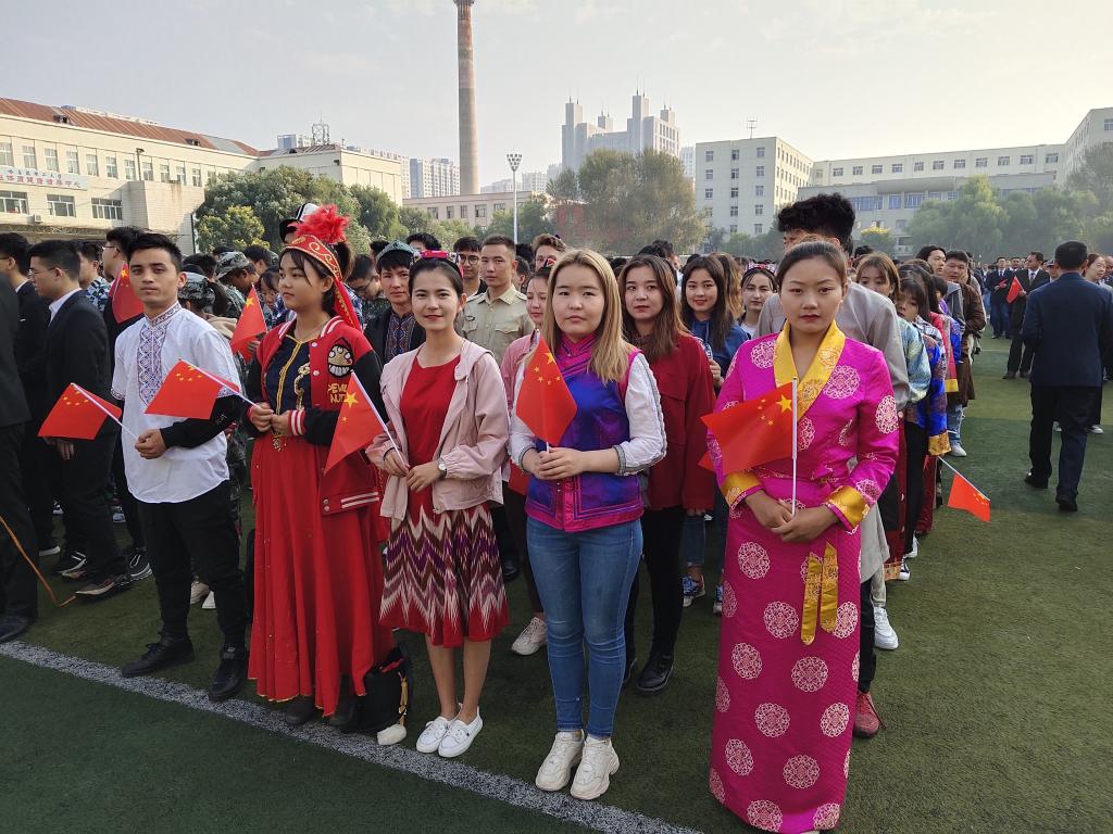 少数民族学生身着民族盛装,升国旗唱国歌,向伟大祖国表白,同上一堂思政课