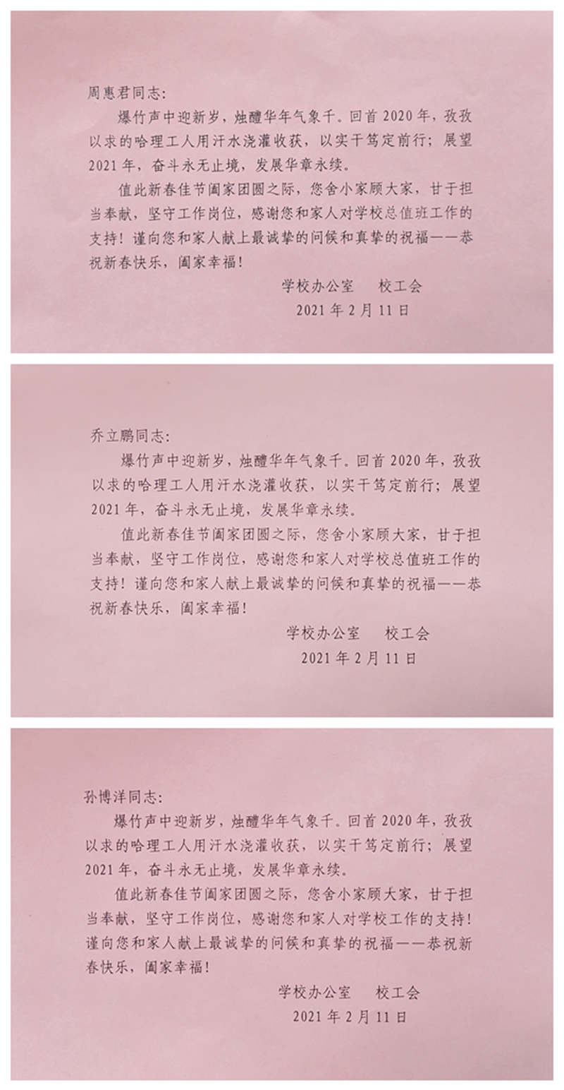 在岗的教职工们对学校领导的亲切慰问和新春祝福表示衷心的感谢。同时纷纷表示,一定坚守岗位、履职尽责,保障学校各项工作的有序开展和相关服务保障设备的正常运行,为打赢校园疫情防控阻击战做出应有的贡献,为校园安全稳定筑起一道坚实的屏障,确保广大师生及家属度过一个欢乐祥和的春节和平安快乐的假期。