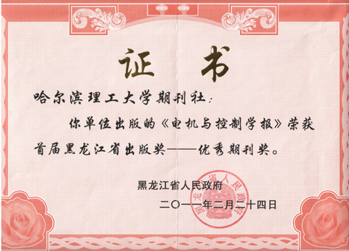 “首届黑龙江省出版奖——优秀期刊奖”证书