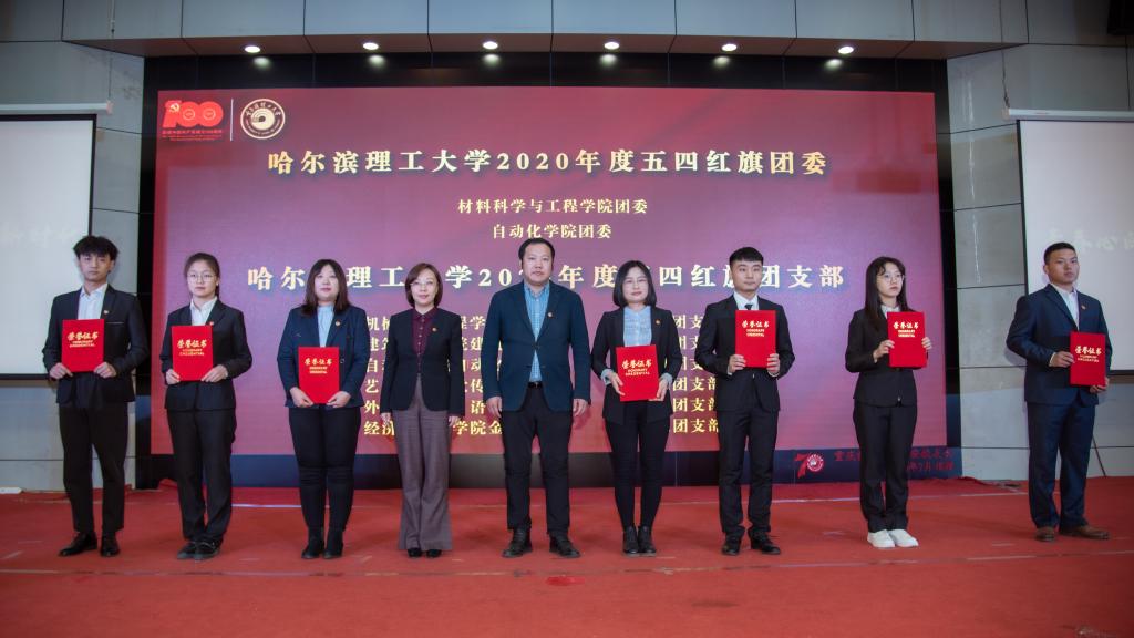 校党委宣传部部长姜国玉、校党委学工部部长(学生处处长)刘迪为2020年度“五四红旗团委”“五四红旗团支部”代表颁奖