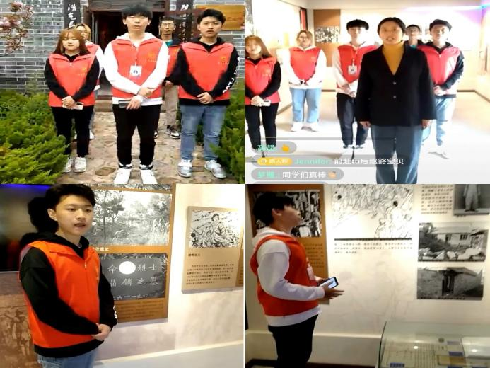 荣成学院学生组成的红色宣讲团成员进行线上直播和现场讲解