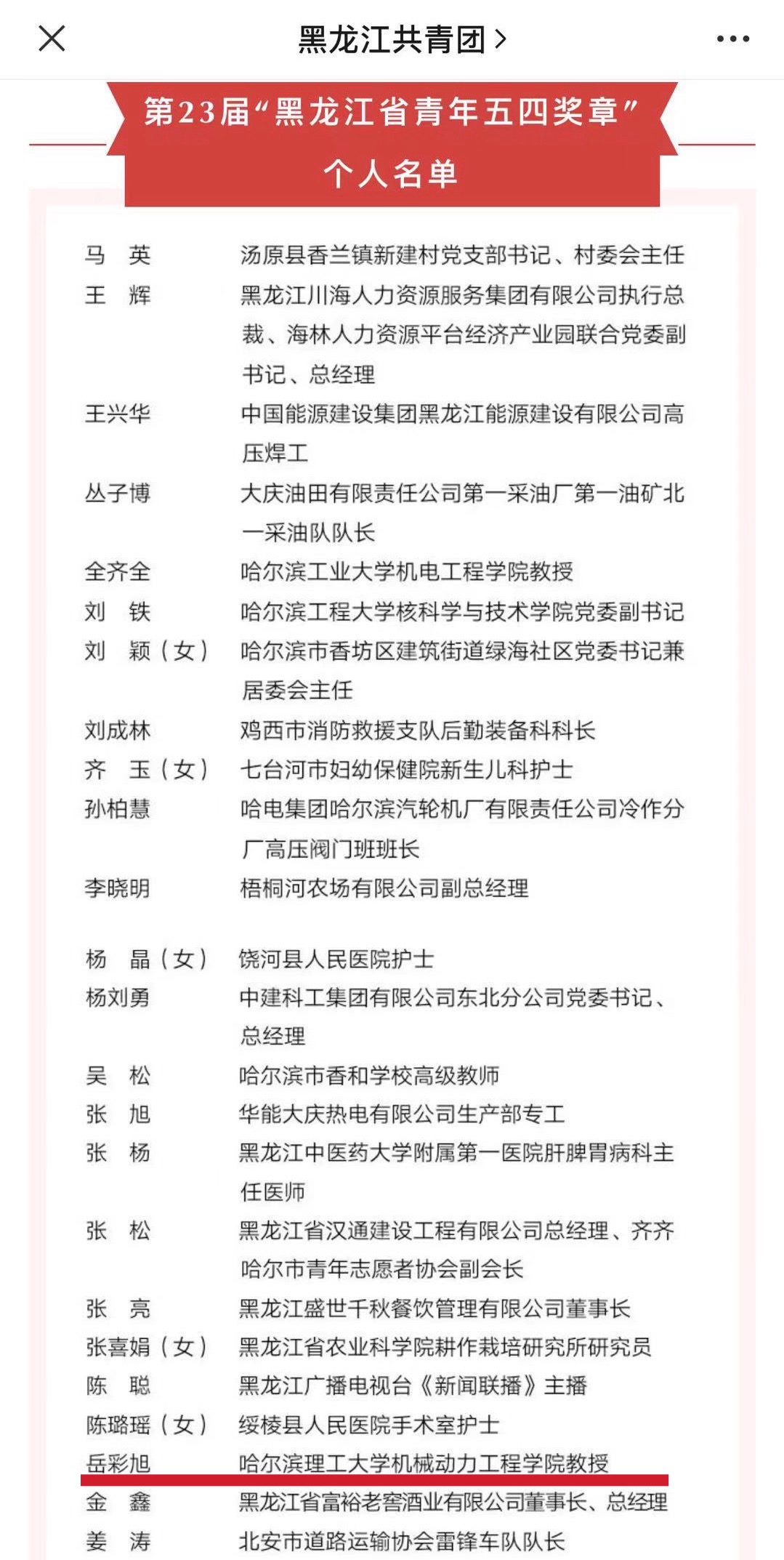 为集中展示新时代龙江青年的精神品格和价值追求,引导我省广大青年担当作为,激励广大青年坚守信念,积极投身全面建设社会主义现代化国家新征程,不负时代,担当作为,建功立业,以优异成绩献礼建党100周年。经第23届“黑龙江省青年五四奖章”评审会议评审、团省委书记会议研究,团省委、省青联决定,授予30名同志第23届“黑龙江省青年五四奖章”,授予11个青年集体第23届“黑龙江省青年五四奖章集体”。其中太阳成官网机械动力工程学院岳彩旭教授荣获第23届“黑龙江省青年五四奖章”荣誉称号!