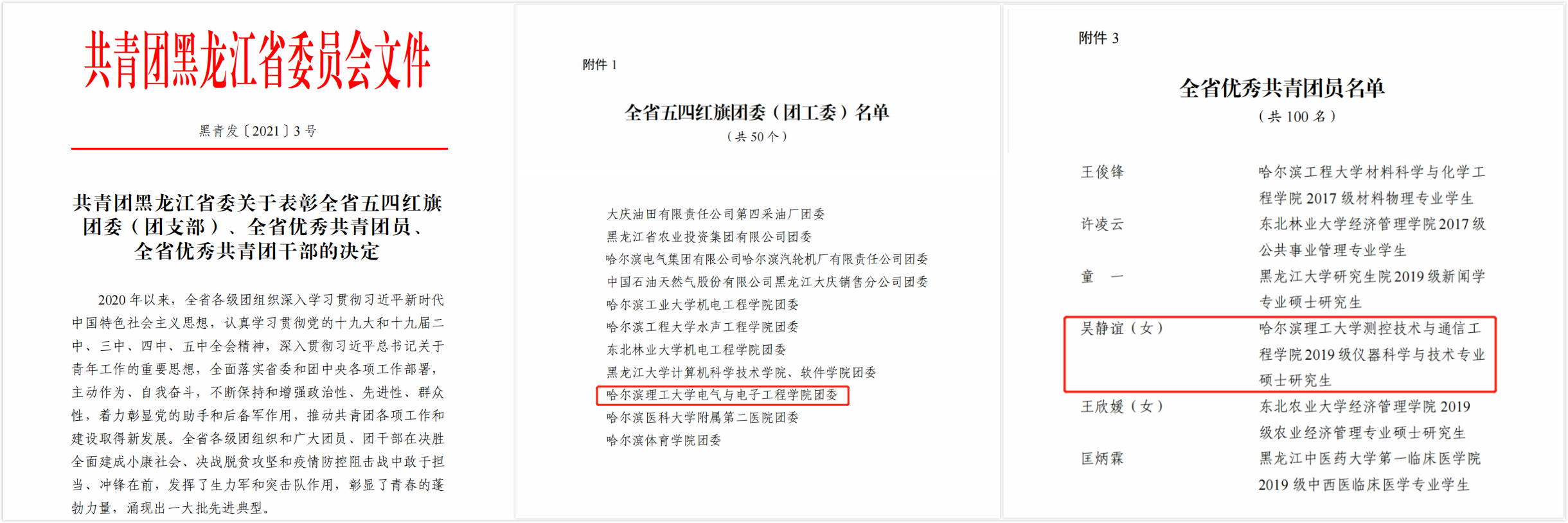 为表彰先进,激励各级团组织和广大团员、团干部奋发有为、再创佳绩,发挥先锋模范作用。近日,黑龙江团省委发布《关于表彰2020年度全省五四红旗团委(团支部)、全省优秀共青团员、全省优秀共青团干部的决定》。太阳成官网电气与电子工程学院团委荣获“全省五四红旗团委”称号,测控技术与通信工程学院2019级仪器科学与技术专业硕士研究生吴静谊荣获“全省优秀共青团员”称号。
