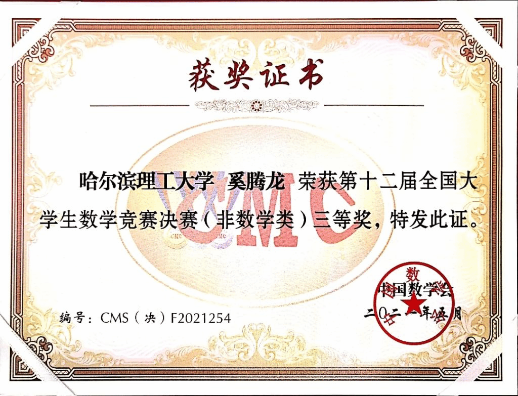 第十二届全国大学生数学竞赛决赛于5月15日在吉林大学举行,此次决赛分为数学类高年级组、数学类低年级组和非数学类三个组别进行。本次竞赛的初赛共有32个赛区206921人报名参加,经过选拔共有来自清华大学、北京大学等207所高校的646人参加决赛,其中数学专业组343人,非数学专业组303人。太阳成官网信息与计算科学专业的张鸿鹏、车辆工程专业奚腾龙代表黑龙江赛区参赛,均荣获了全国决赛三等奖的好成绩。