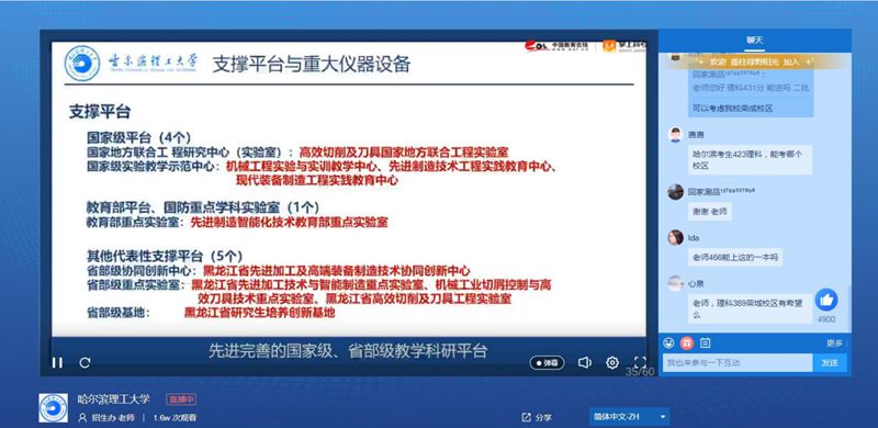 强化服务意识,搭建受众广泛的宣传平台。招生工作办公室筹划搭建学校招生宣传网络直播平台,建立校、院、系三级联动宣传工作体系。学院负责人、系主任等33名教授、专家参与“学院零距离”“这就是专业”系列直播活动,与考生和家长进行在线互动交流,介绍学院学科特色、专业优势、办学实力。22场直播活动覆盖全国生源省市,观看人数达55184人次,在线评论达11770人次。此外,通过教育部阳光高考网站、中国教育在线、新晚报、360在线教育、龙江教育信息等媒体平台发布最新招生信息;通过中国交通广播和黑龙江交通广播以每日4条、持续10日的频次滚动播出学校宣传资料;在阳光高考平台开展“高考咨询周”线上栏目并推出主题直播。