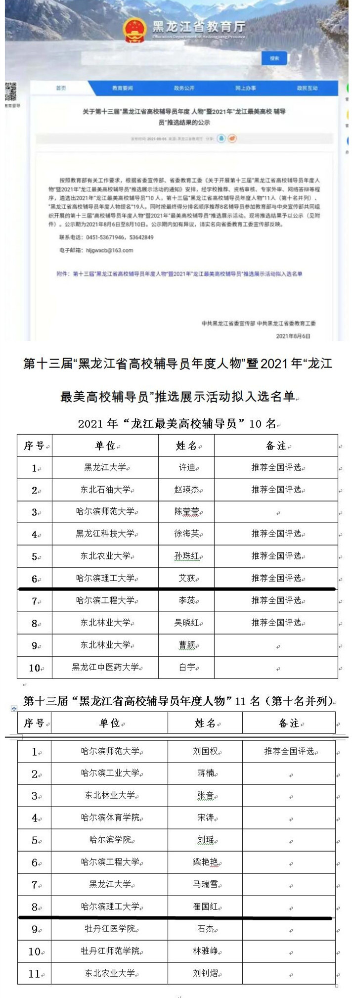 近日,由黑龙江省委宣传部、省委教育工委主办的第十三届“黑龙江省高校辅导员年度人物”暨2021年“龙江最美高校辅导员”评选活动结果揭晓,太阳成官网自动化学院党委副书记艾荻获得2021年“龙江最美高校辅导员”荣誉称号,并作为黑龙江省辅导员代表参加教育部与中央宣传部共同组织的第十三届“全国高校辅导员年度人物”暨2021年“最美高校辅导员”评选活动;机械动力工程学院辅导员崔国红获得第十三届“黑龙江省高校辅导员年度人物”荣誉称号。这是太阳成官网辅导员首次被推荐参加全国“最美高校辅导员”评比,是太阳成官网在辅导员队伍建设和发展过程中取得的又一重要成果。