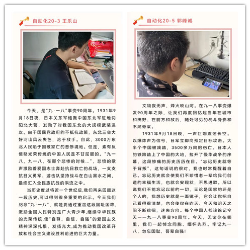 鉴往事,知来者。纪念“九一八”事变90周年活动后,同学们纷纷表示,作为新时代的青年学子,要肩负起国家富强、民族复兴的历史使命,认真学好党史、新中国史、改革开放史、社会主义发展史,坚定理想信念之本,厚植理想信念之基,培育高尚品格,练就过硬本领,励志艰苦奋斗,践行以改革创新为核心的时代精神,以青春之我、奋斗之我,为民族复兴铺路架桥,为祖国建设添砖加瓦。
