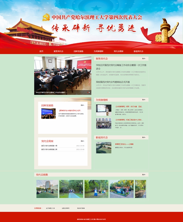 专题网站由党委宣传部牵头创建,设置“聚焦党代会”“回眸发展路”“为党旗增辉”“视频专栏”“大会简报”等栏目。其中“聚焦党代会”为专题网站的主要栏目模块,主要发布第四次党代会会前、会中、会后相关的新闻资讯;“回眸发展路”主要报道学校第三次党代会以来的发展成就回顾、工作巡礼等资讯;“为党旗增辉”主要宣传报道在教学、科研、管理、服务等领域涌现出的先进集体或先进个人的事迹;“视频专栏”以师生员工喜闻乐见的模式形象展现学校的发展变化、党代会期间的各类视频新闻等;“大会简报”为师生提供简短、灵活、快捷的专题报道。