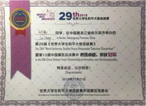 英语MA学生刘畅获《第29届世界大学生和平大使选拔赛》冠军