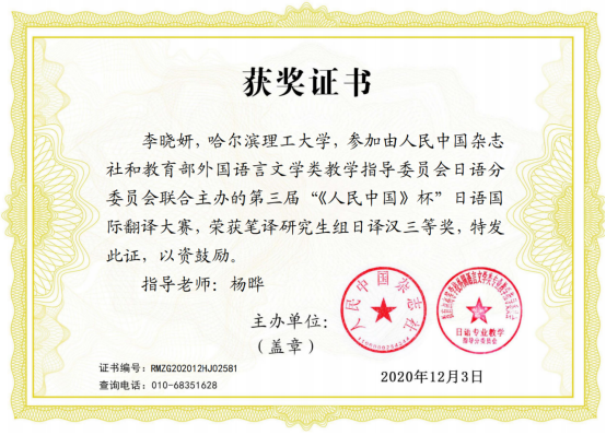 日语19级MTI李晓妍(人民中国杯日语国际翻译大赛笔译研究生组日译汉三等奖证书)