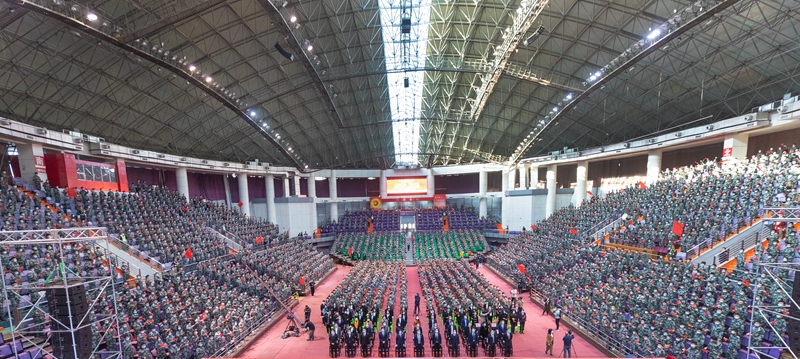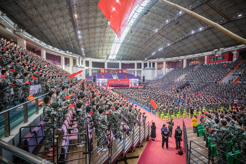各学院及各职能部处负责人、教师代表、新生辅导员,2021级本、硕、博新生参加典礼。根据疫情防控的要求,本次开学典礼以“线上线下相结合”的形式召开,“一校两地三区”同时进行,主会场设在西区体育馆,西区、南区和荣成校区共设置52个分会场,“一校两地三区”的6796名本科生、1767名研究生通过视频连线相聚“云端”,共同观礼。(摄影:耿洪杰、隋然)