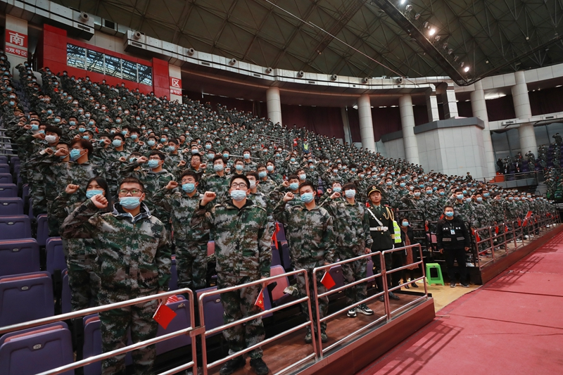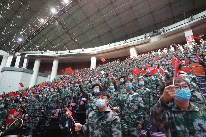 典礼最后,测控技术与通信工程学院测控技术与仪器专业2021级6班张绍鹏领誓,全体2021级新生举起右拳,进行集体入学宣誓。在全场师生共同唱响《歌唱祖国》的豪迈歌声里,开学典礼落下帷幕。