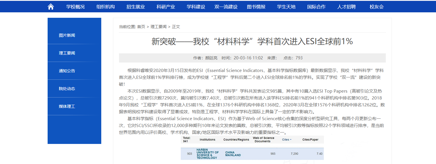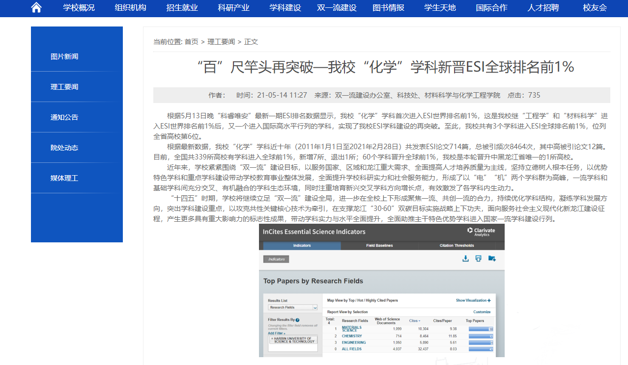 学院”材料科学”和”化学”学科进入ESI全球排名前1%