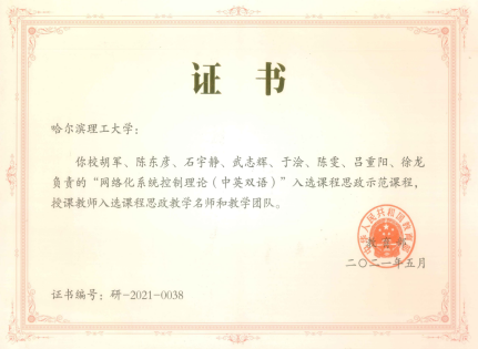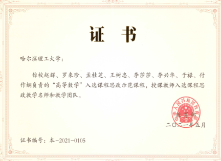 获批首批国家级课程思政示范课程、课程思政教学名师和团队。2021年本科生课程《高等数学》及其课程团队(赵辉、罗来珍、孟桂芝、王树忠、李莎莎、李兴华、于禄、付作娴)、研究生课程《网络化系统控制理论(中英双语)》及其课程团队(胡军、陈东彦、石宇静、武志辉、于浍、陈雯、吕重阳、徐龙)获批首批国家级课程思政示范课程、课程思政教学名师和团队。
