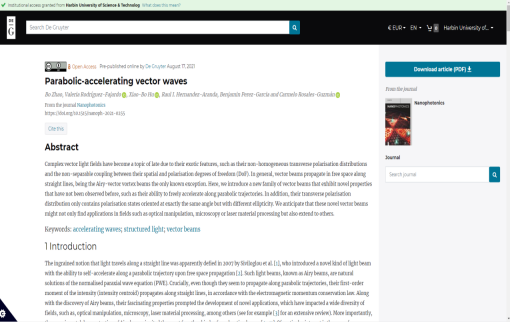 高水平科研人才不断涌现,代表性成果产出加速。2020年,胡军教授入选爱思唯尔(Elsevier)正式发布的“中国高被引学者”榜单,黑龙江省总计只有4位学者入选2020年中国高被引学者榜单“数学学科”。朱智涵老师获评2017年度中国新锐科技卓越影响奖。《空间结构光场量子非线性调控物理及技术研究》获批中央支持地方高校改革发展资金高水平人才项目;青年教师赵波作为第一作者在国际知名学术期刊《Nanophotonics》(中科院一区TOP期刊,影响因子8.449)发表了题为“Parabolic-accelerating vector waves”的研究论文。