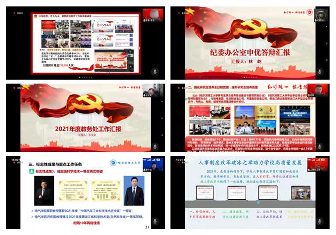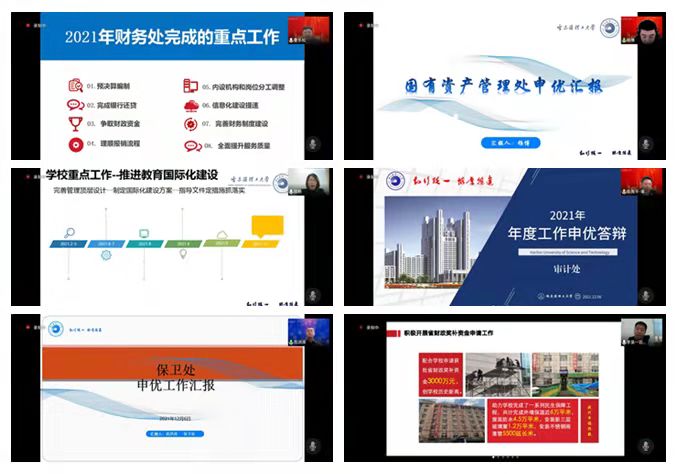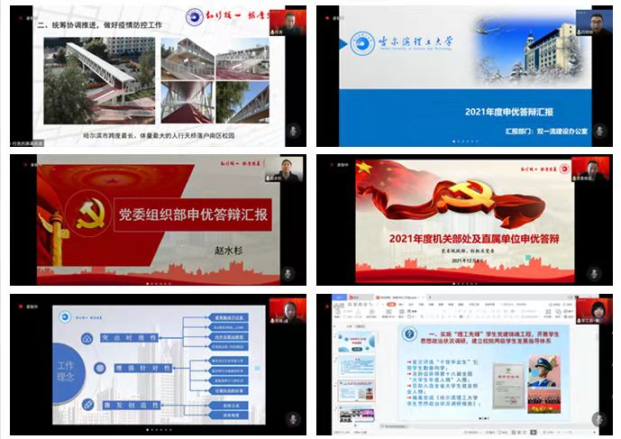 此次申优答辩采取“自愿申报、现场述职、集中测评”的方式进行,经各单位自愿申报,全校共有18个部处及直属单位参加答辩。学校办公室、双一流建设办公室、党委组织部、党委统战部、党委宣传部、学生工作部(处)、团委、纪委办公室、教务处、研究生处、科技处、人事处、财务处、国有资产管理处、国际合作与交流处、审计处、保卫处、后勤管理服务中心负责人立足“明确主攻方向、聚焦发展动能、提高履责效能”的理念,依次结合各自单位工作特色亮点,以屏幕共享方式进行PPT汇报答辩。汇报内容聚焦本单位2021年度工作中取得的标志性成果和重大突破,结合所承担的学校年度重点工作任务,总结凝练工作中的创新举措、特色亮点和工作成效。
