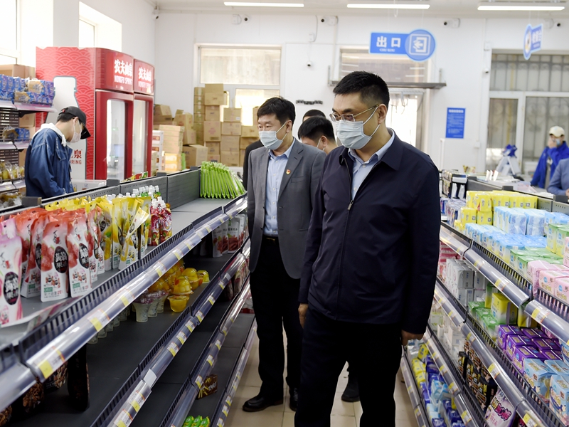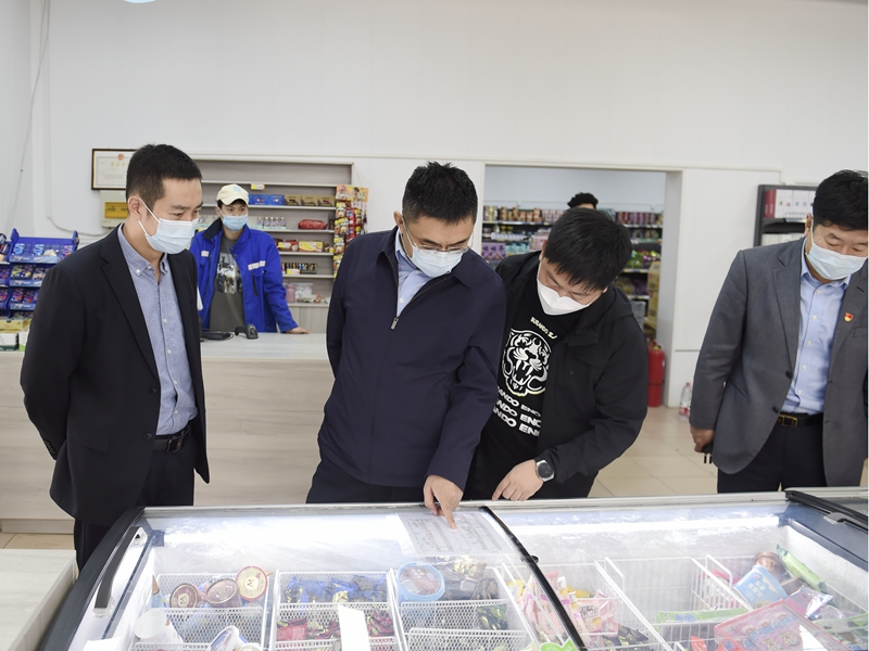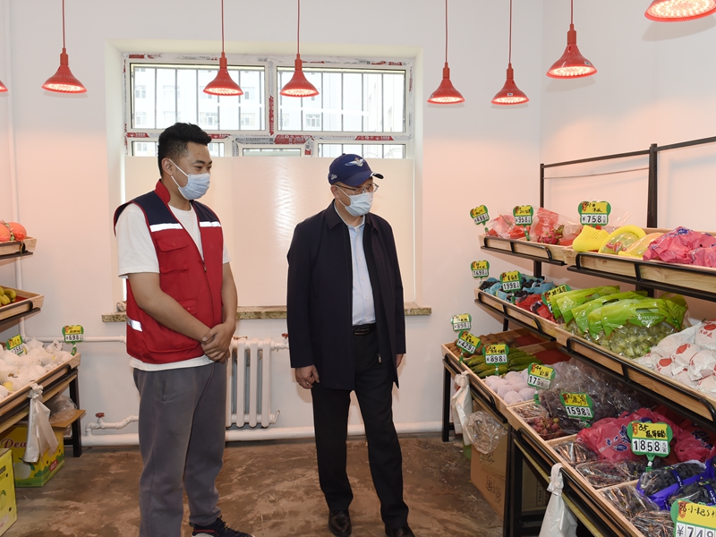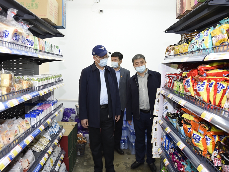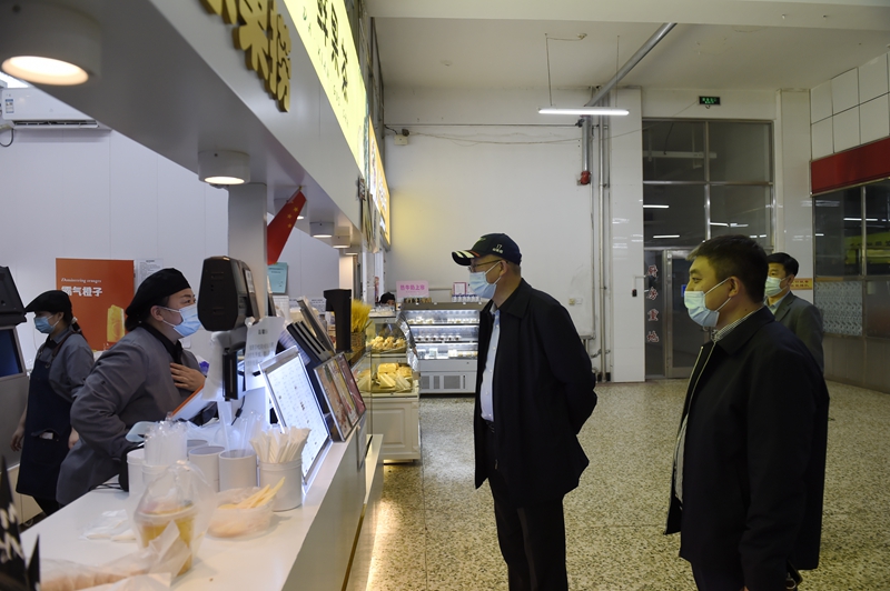 在校内商服,校领导详细了解进店扫码、测温、戴口罩情况、进货防疫消杀、错峰限流等方面情况,查看店内商品种类、价格、质量等,同时与进店购物学生交谈,听取学生的反馈意见。校领导强调,校内商服要始终坚持以服务学生为宗旨,重视学生多样化需求,不断创新服务理念、优化服务流程,保证商品质量,稳定商品价格,满足学生日常生活需要。