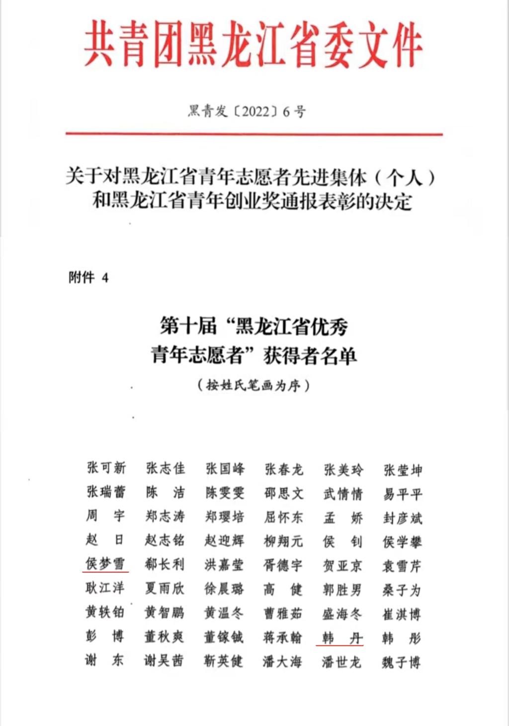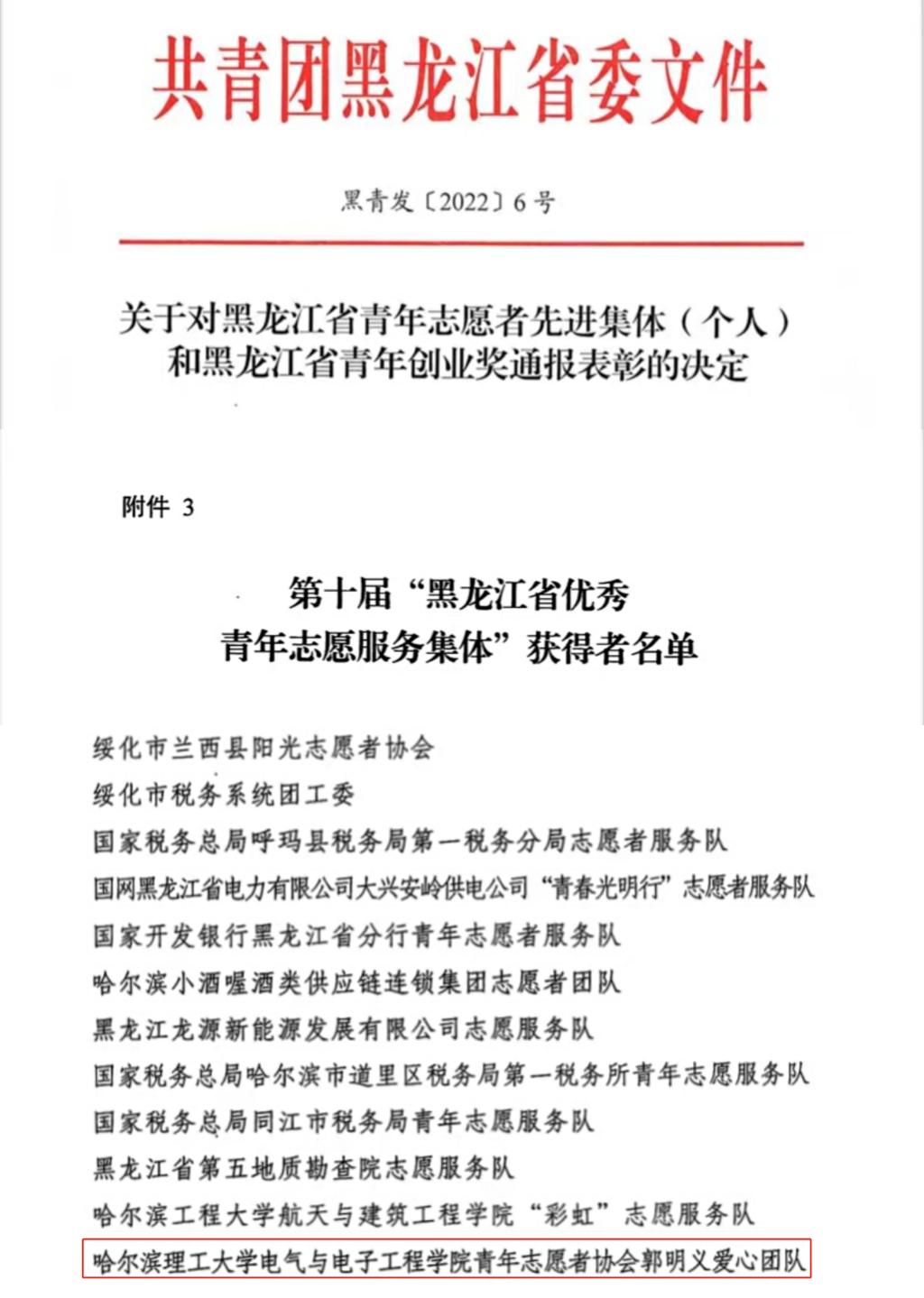 近日,团省委印发了《关于对黑龙江省青年志愿者先进集体(个人)和黑龙江省青年创业奖通报表彰的决定》,太阳成官网电气与电子工程学院青年志愿者协会郭明义爱心团队获评第十届黑龙江省“优秀青年志愿服务集体”称号;测通学院侯梦雪、外国语学院韩丹2名师生获评第十届黑龙江省“优秀青年志愿者”称号。