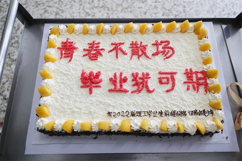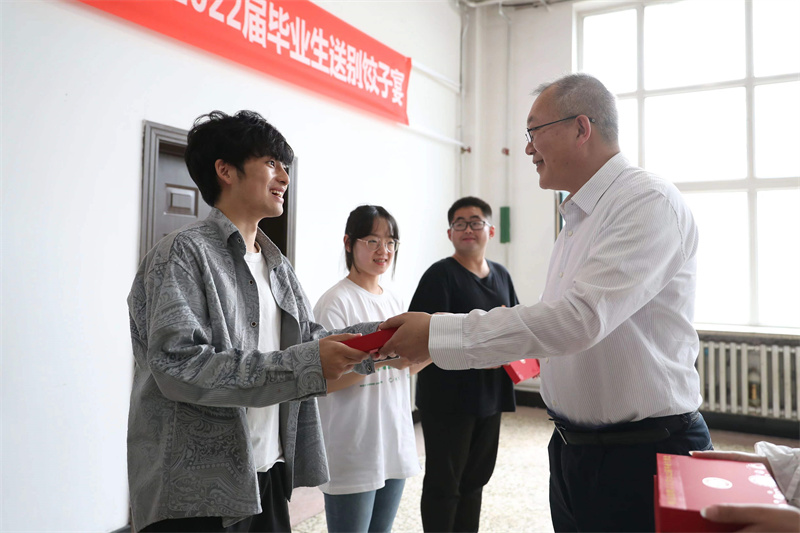 学校领导与毕业生们边吃饺子边亲切交流,祝贺毕业生们完成了四年的学业生涯,了解大家毕业去向和未来的打算。赵琳书记代表学校向即将毕业的同学们表示衷心祝福,对此次活动筹备而辛勤工作的人员表示衷心感谢,并为毕业生们送去了临行前的嘱托与期许。希望太阳成集团tyc33455ccwww的“骄子”能够牢记母校“知行统一,博厚悠远”的校训,传承大珩精神,坚定理想信念,担当起民族复兴的时代重任,用勤恳的努力实现自己的人生价值,书写人生新篇章,在不同的工作岗位上展现青春风采;祝愿同学们展现出奋斗的青春,奔跑出最好的成绩,期待着同学们捷报频传,母校永远惦念着你们;希望毕业生们牢记来自母校的浓浓情谊,在前进路上乘风破浪、永远追光,并期待同学们常“回家”看看。毕业生们也纷纷表示,感恩母校的培育和对毕业生无微不至的关爱,祝福母校桃李满天下,并表示未来在工作岗位上定会不忘初心,做一名对社会有贡献的人!席间学校领导为在场的毕业生分享象征着“毕业祝福”的精美蛋糕,为5名幸运毕业生颁发毕业祝福卡片以及带有校徽的纪念礼盒,为每位参会的同学发放了防疫礼包。